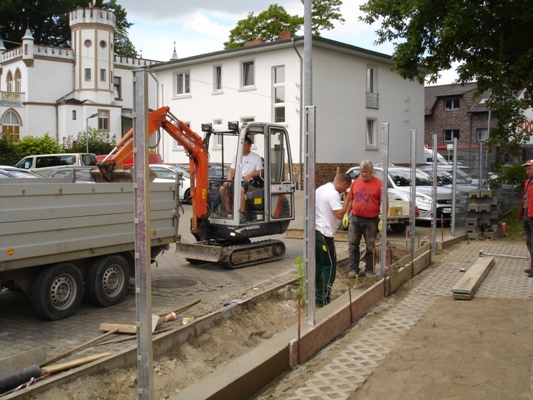 Bei der Durchführung von grösseren Projekten ist der Einsatz von Technik im Tiefbau wichtige Voraussetzung für einen angemessenen Zeitrahmen. (Hier: Erstellung eines 20 m Streifenfundaments mit Pfosten für Doppelstabmatten)